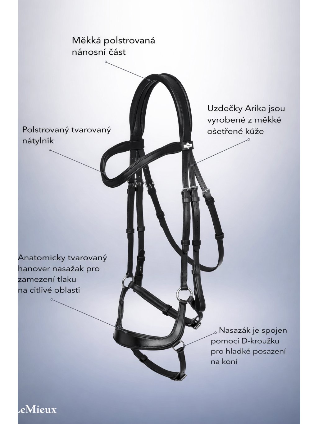 Tato anatomická uzdečka je vyrobena z velice měkké a poddajné olejované kůže. Uzdečka disponuje anatomicky tvarovanou čelenkou a nánosníkem, které jsou tvarované tak, aby se zabránilo tlaku na citlivá místa na hlavě koně a měkce polstrovaným nátylníkem. Na uzdečce je stříbrné kování. Otěže jsou prodávany samostatně.