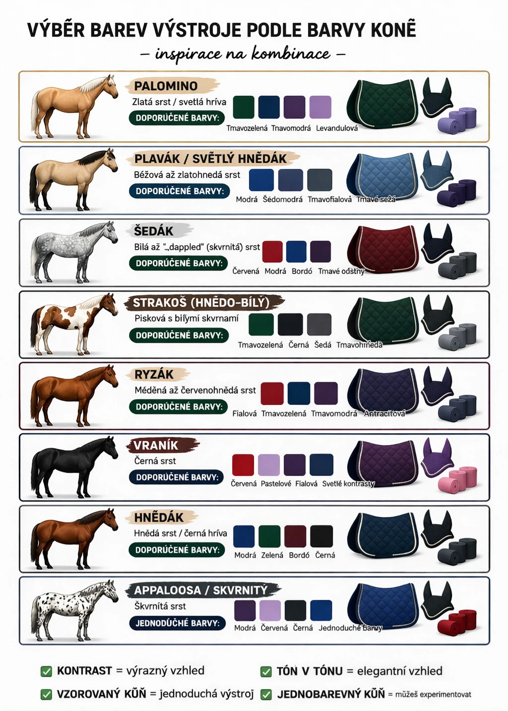 Jednoduchý prehľad kombinácií, ktoré najlepšie zvýraznia jednotlivé typy koní. Ideálne na inšpiráciu pri výbere podsedlovej dečky, čabraky aj doplnkov.