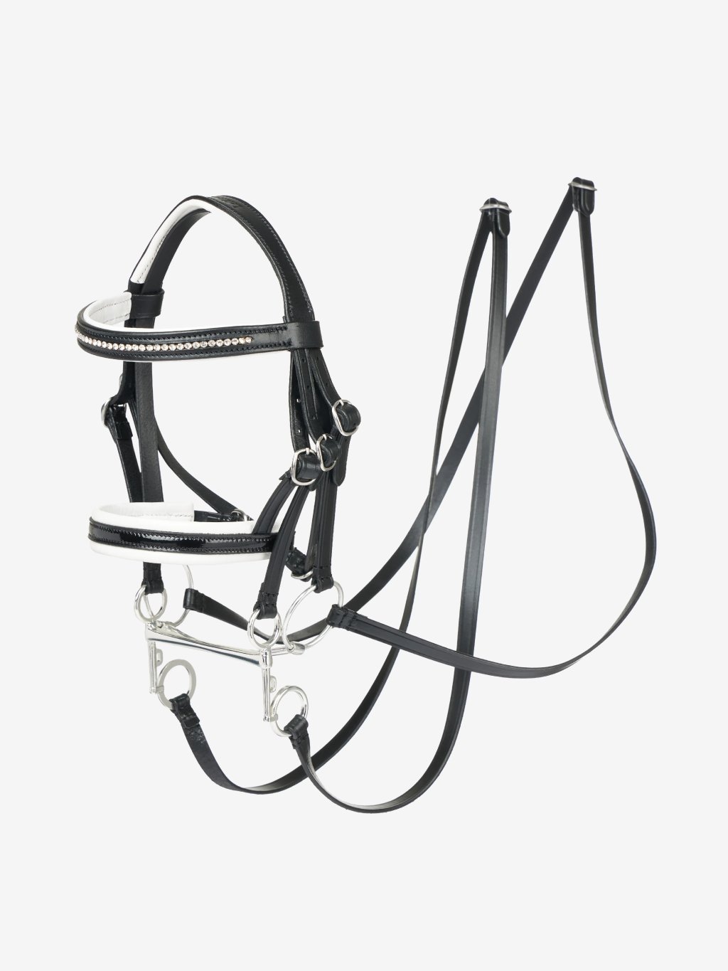 Polstrovaná čelenka s třpytivými kamínky dodává typický vzhled LeMieux, zatímco měkce polstrovaný nánosník z bílé kůže v kombinaci s černým lakem vytváří autentický drezurní dojem.
