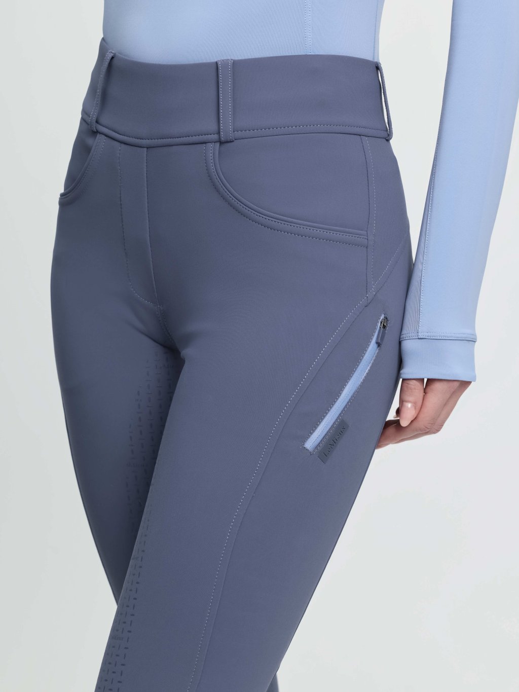 Spodní část nohavic je chytře navržena bez vnitřního švu, což zajišťuje maximální pohodlí a lepší kontakt s koněm. Tvarované švy lichotí postavě, zatímco tenká síťovaná ponožková manžeta snižuje objem pod vysokými jezdeckými ponožkami a kozačkami.