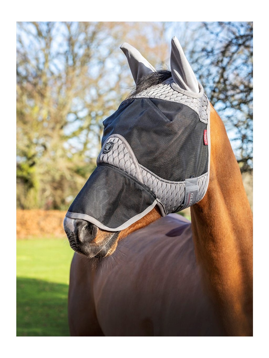 Maska proti hmyzu Gladiator od LeMieux poskytuje koním opravdu velkorysý prostor kolem očí a skvělý střih, pro maximální pohodlí. Černá síťka s UV filtrem je prodyšná a poskytuje jasný a ničím nerušený výhled, je taky extrémně pevná, proto se nemusíte bát, že se hned zničí. Protože pohodlí koní, je v LeMieux prioritou, je maska navíc podšitá změkčenými pruhy přes čelo a nos. Šedý svršek z 3D uhlíkové síťoviny umožňuje dostatečné proudění vzduchu, aby byl váš kůň v pohodě, a elastický náhlavní a krční pásek umožňuje pevné uchycení. Prodyšné síťované uši zabraňují podráždění mouchami a pakomáry a prodloužená nosní část poskytuje UV ochranu citlivým nosům.