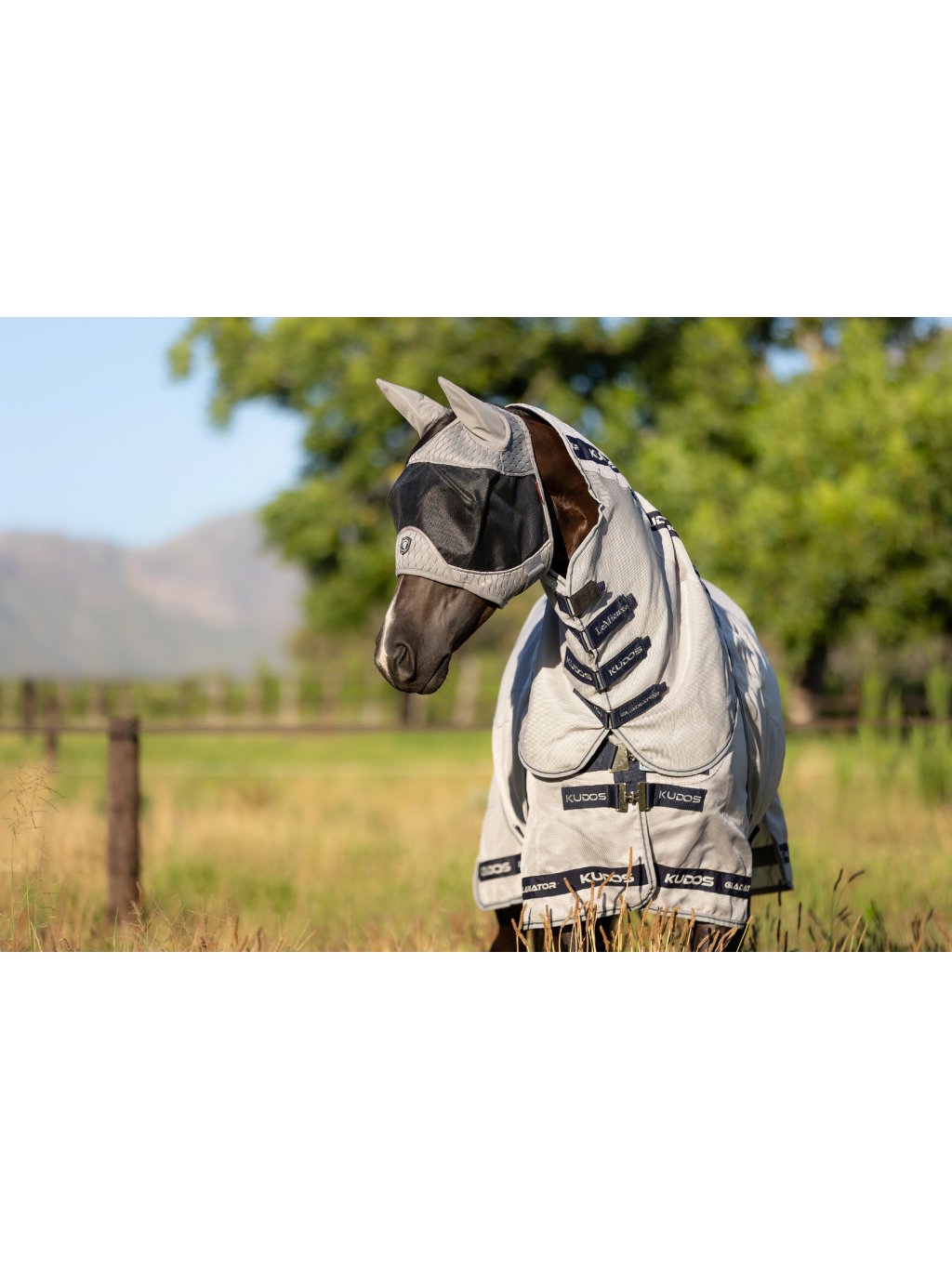 Maska proti hmyzu Gladiator od LeMieux poskytuje koním opravdu velkorysý prostor kolem očí a skvělý střih, pro maximální pohodlí. Černá síťka s UV filtrem je prodyšná a poskytuje jasný a ničím nerušený výhled, je taky extrémně pevná, proto se nemusíte bát, že se hned zničí. Protože pohodlí koní, je v LeMieux prioritou, je maska navíc podšitá změkčenými pruhy přes čelo a nos. Šedý svršek z 3D uhlíkové síťoviny umožňuje dostatečné proudění vzduchu, aby byl váš kůň v pohodě, a elastický náhlavní a krční pásek umožňuje pevné uchycení. Prodyšné síťované uši zabraňují podráždění mouchami a pakomáry a prodloužená nosní část poskytuje UV ochranu citlivým nosům.