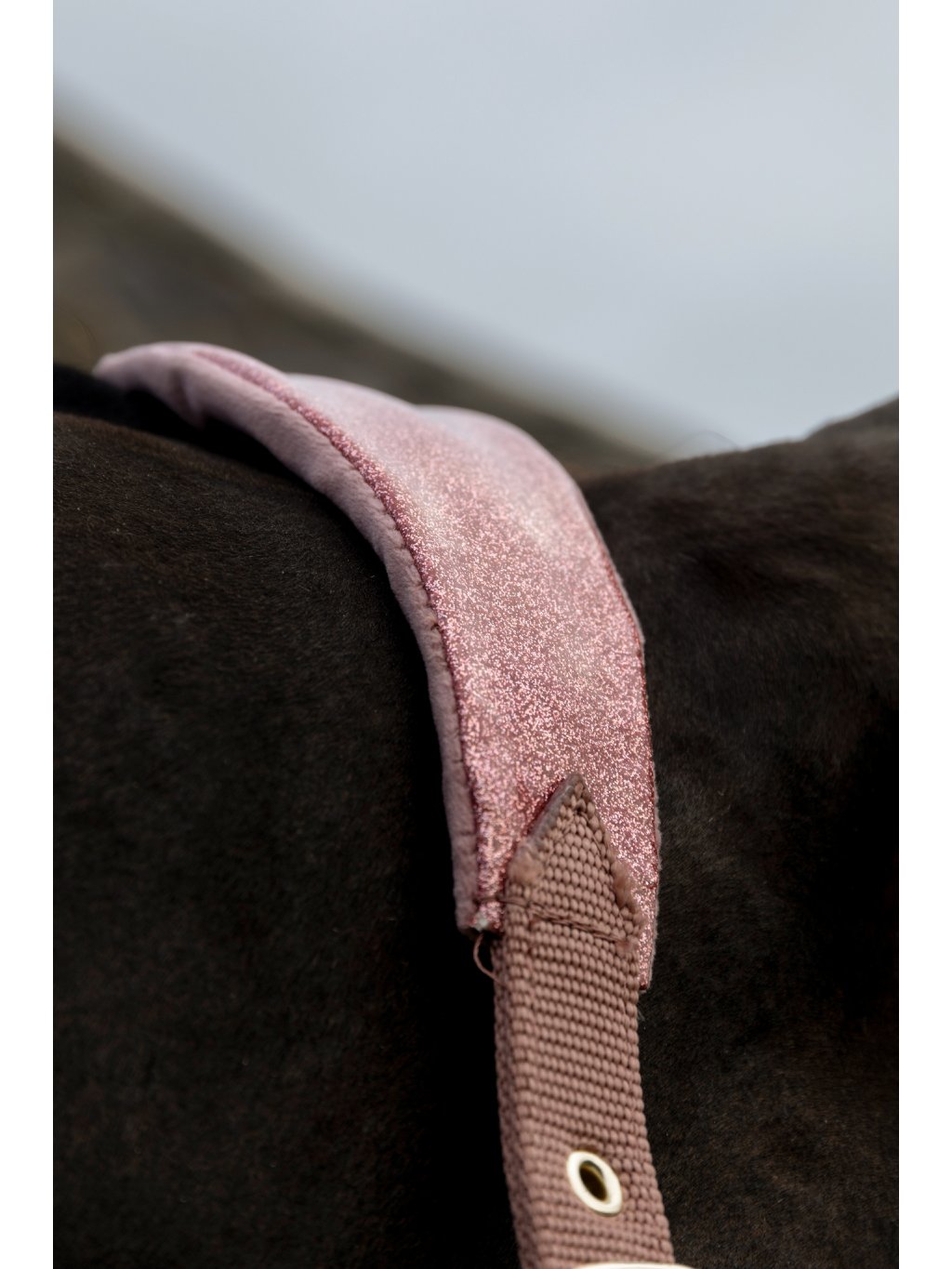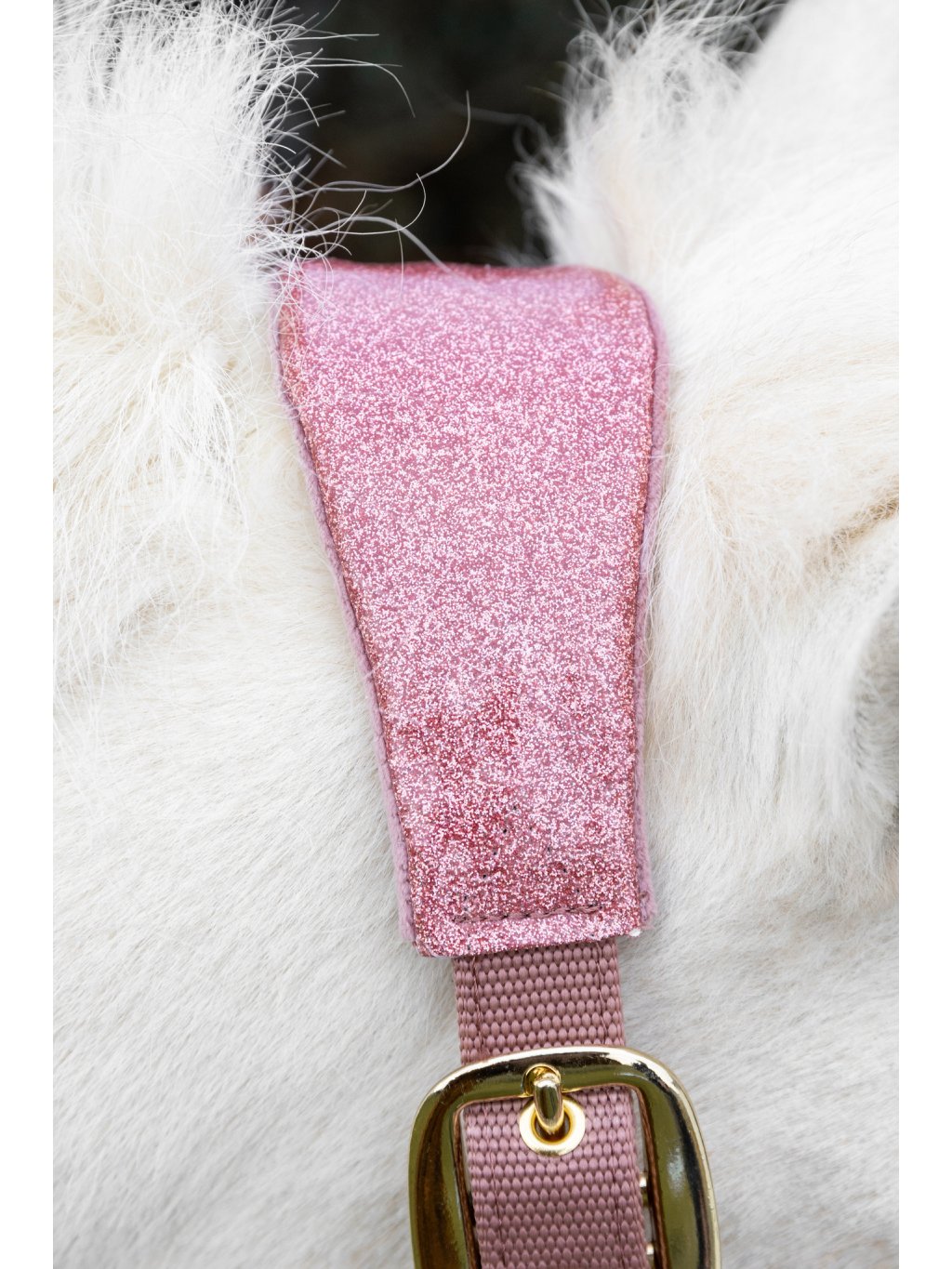 Velvet Halter Unicorn Glitter je ohlávka, která v sobě spojuje luxusní vzhled, komfort a praktičnost. Je vyrobena z pevného nylonu, který zajistí bezpečí vašeho koně nebo poníka, zatímco měkké sametové polstrování na nánosníku, lícnicích a nátylníku poskytuje maximální pohodlí. Jemný třpytivý efekt v kombinaci se starorůžovým odstínem dodává ohlávce decentní eleganci bez zbytečné nápadnosti.