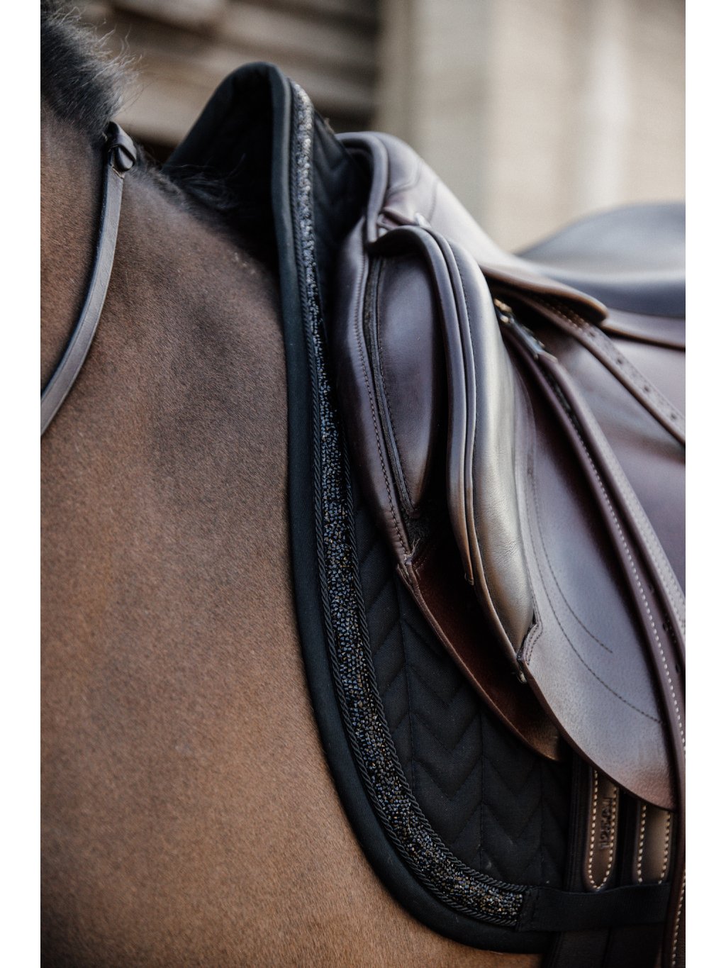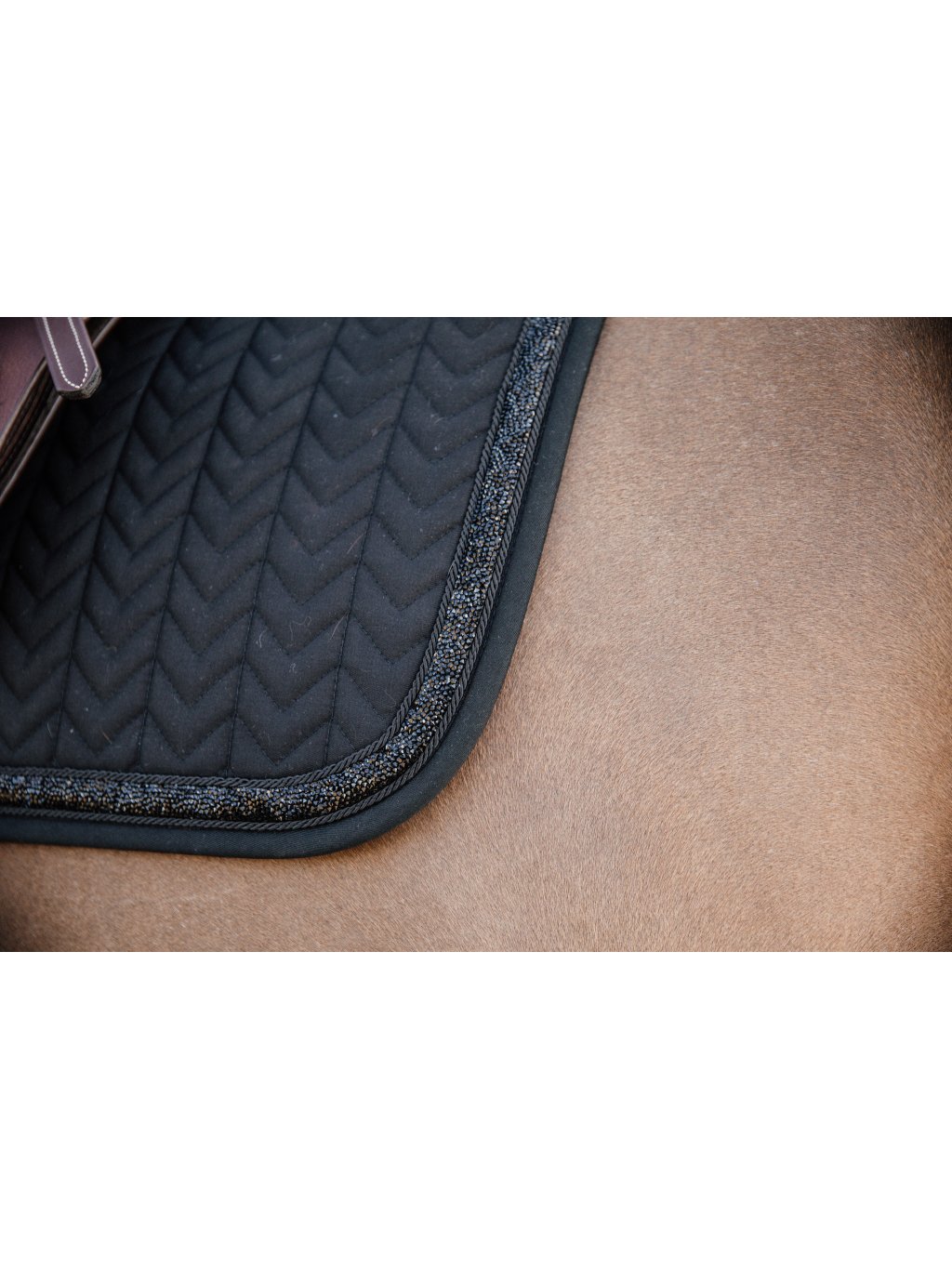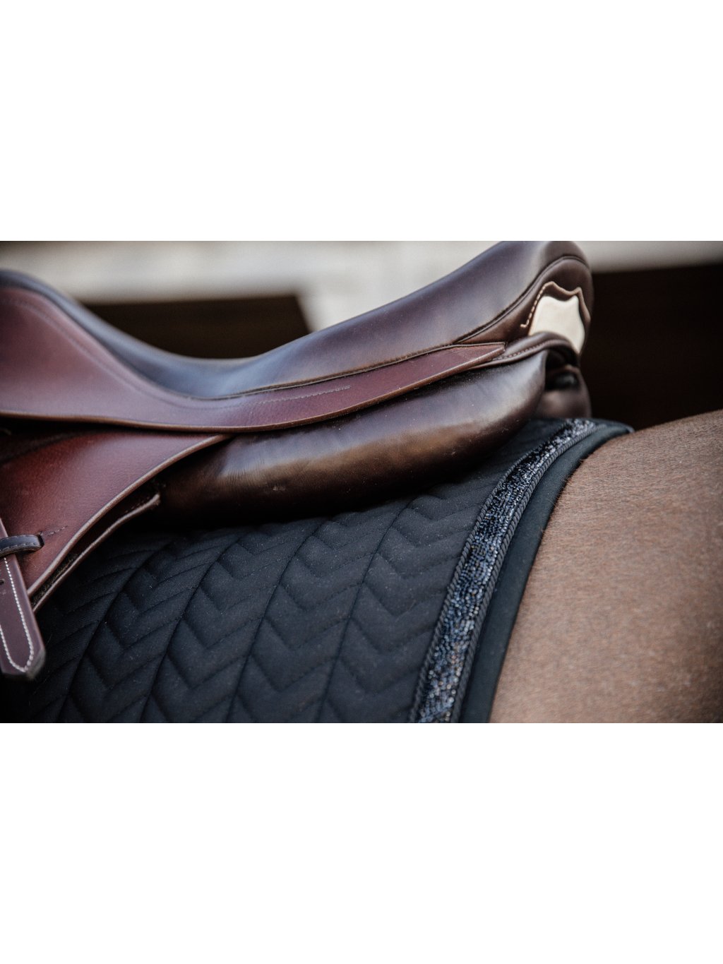 Luxusní podsedlová dečka se třpytivými kamínky a originálním prošíváním. Stylová, pohodlná a ideální na skokové i drezurní ježdění – bez zbytečných popruhů, pouze s poutkem na podbřišník.