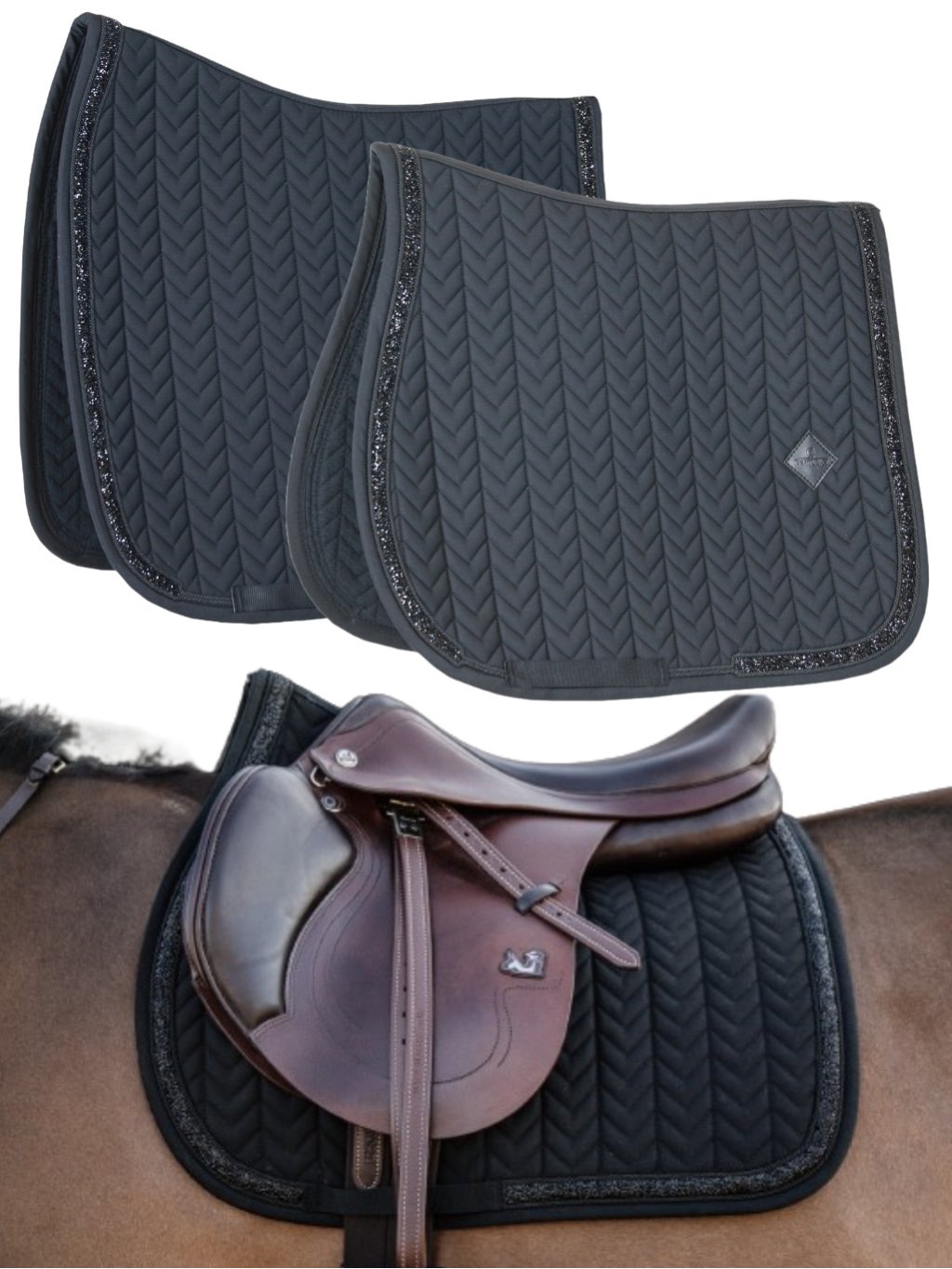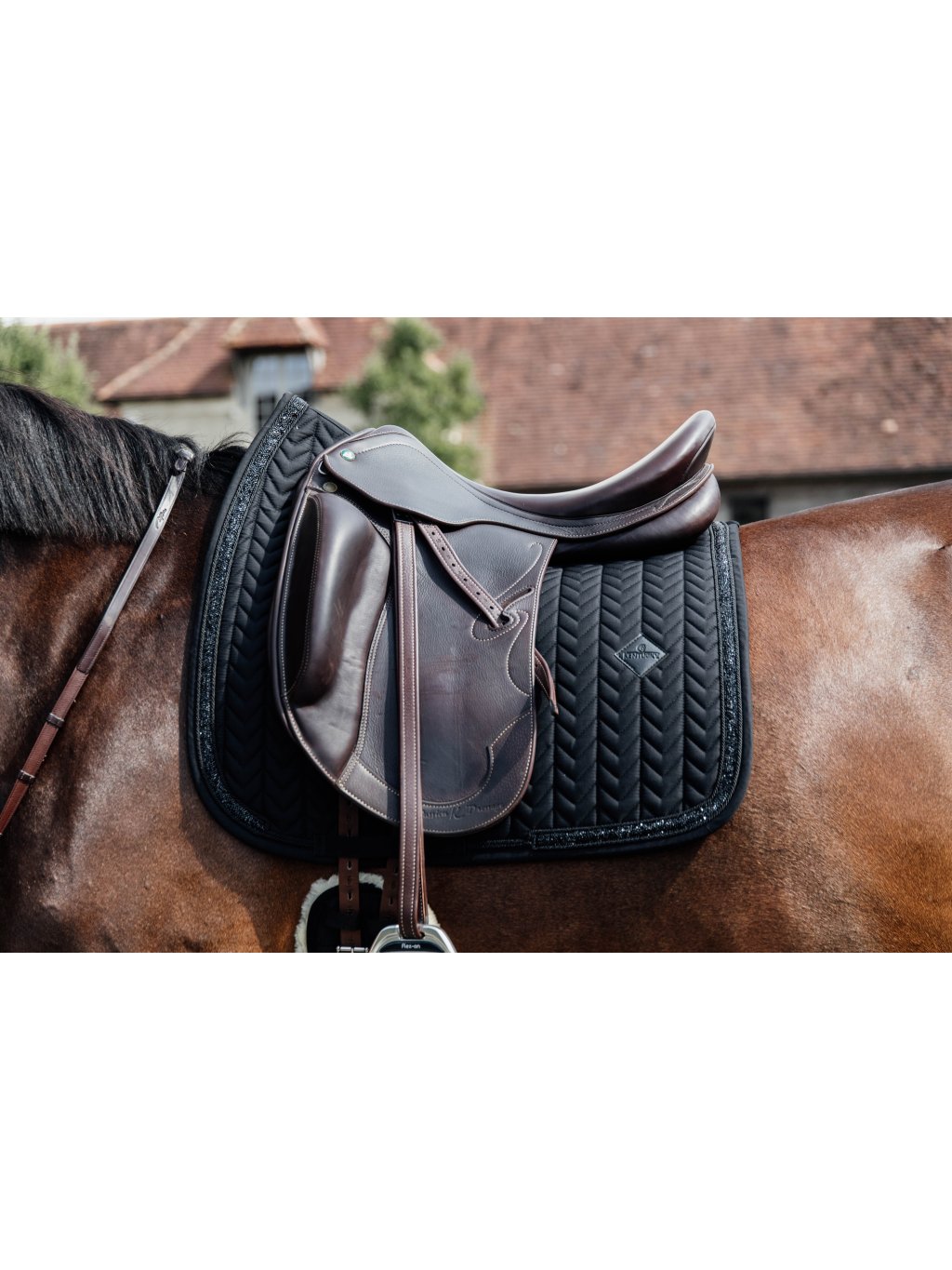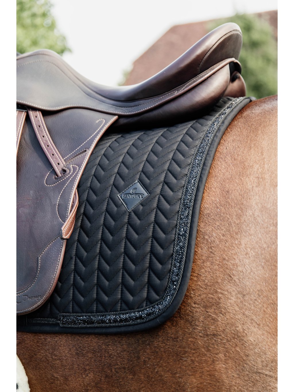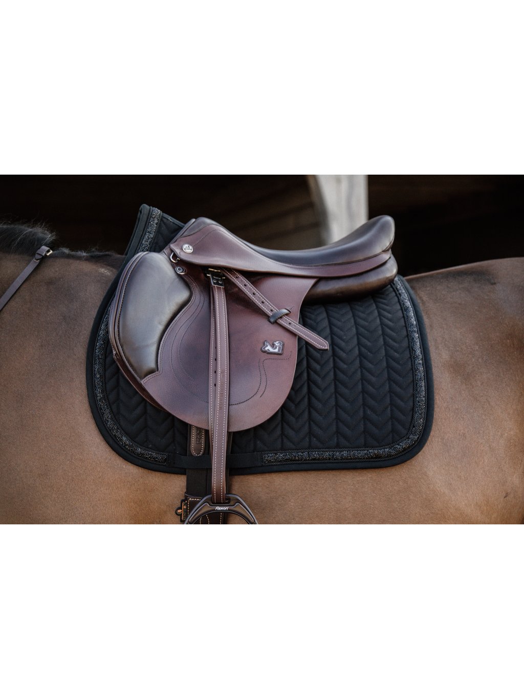 Luxusní podsedlová dečka se třpytivými kamínky a originálním prošíváním. Stylová, pohodlná a ideální na skokové i drezurní ježdění – bez zbytečných popruhů, pouze s poutkem na podbřišník.