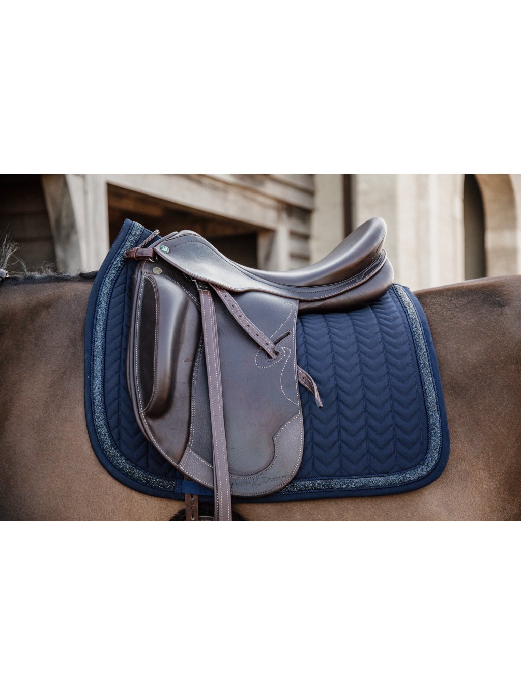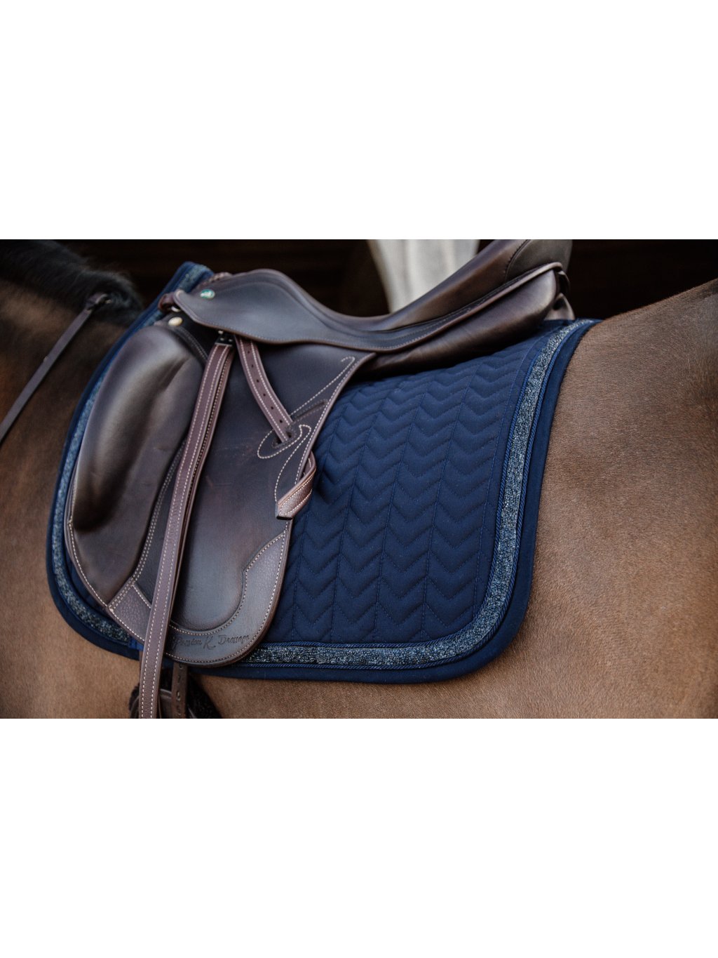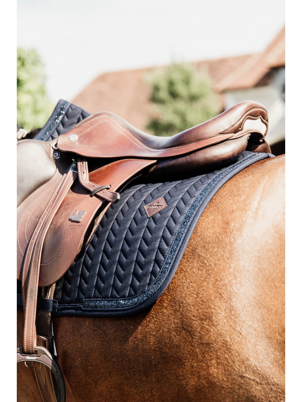Luxusní podsedlová dečka se třpytivými kamínky a originálním prošíváním. Stylová, pohodlná a ideální na skokové i drezurní ježdění – bez zbytečných popruhů, pouze s poutkem na podbřišník.