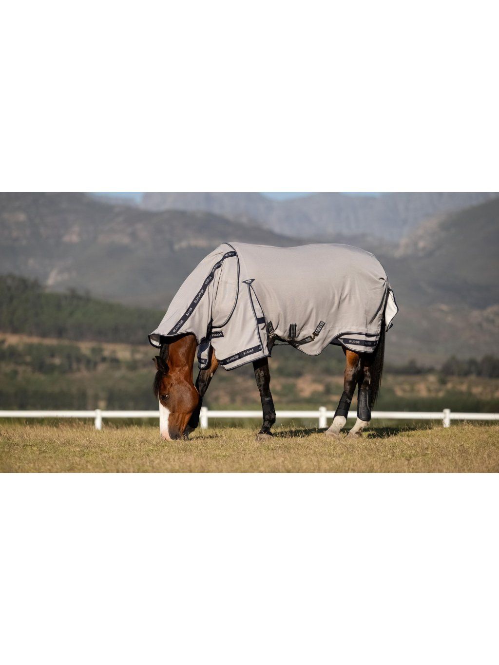 Kudos Gladiator Fly je luxusní síťová deka vyrobená z prvotřídní odolné síťoviny, která časem dokáže přizpůsobit svoji strukturu vláken tvaru koně. Lehká síťovina je vyrobená z odolného nylonu a monofilního polyesteru, díky čemuž je tato deka maximálně prodyšná, přirozeně odpuzuje vodu a podporuje rychlé schnutí. Prodloužená tvarovaná chlopeň na břiše ochrání před hmyzem i toto citlivé místo. Deka koni poskytne ochranu před 80% UV paprsků. Krk lze odepnout.
